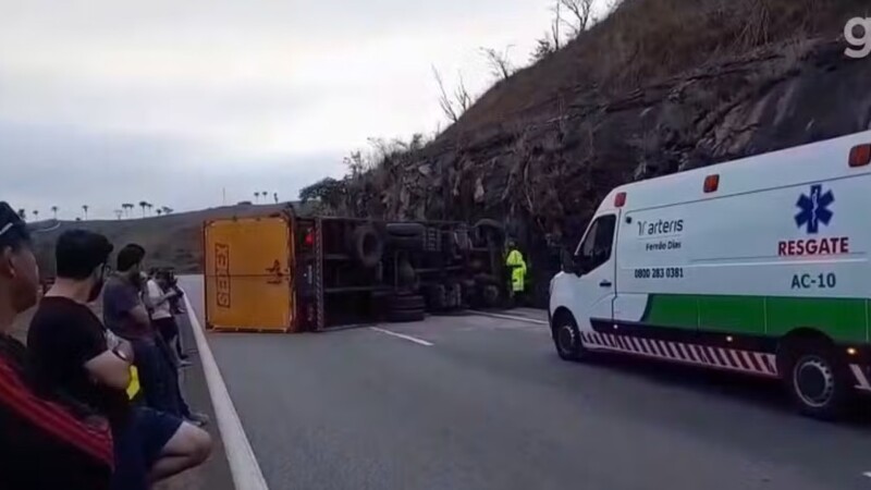 Caminhão tomba na Rodovia Fernão Dias e interdita via em Itaguara, na Grande BH